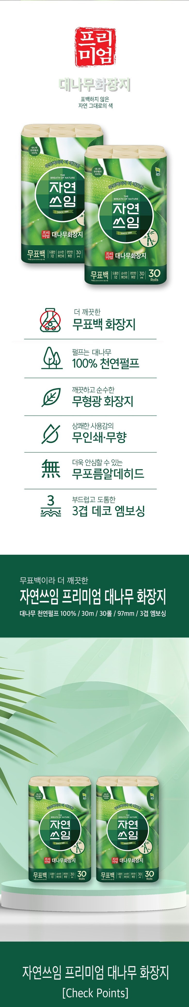 품명 및 모델명 자연쓰임 프리미엄 대나무 천연펄프 화장지 3겹 30m 30롤 2팩 총 60롤